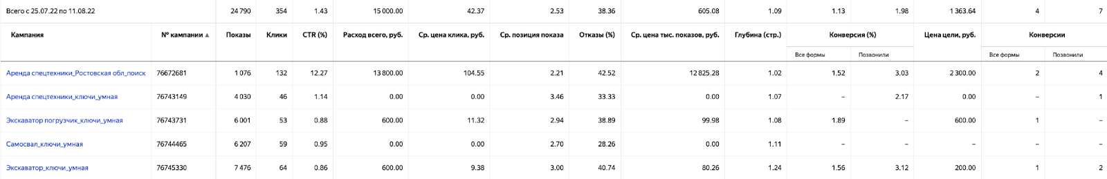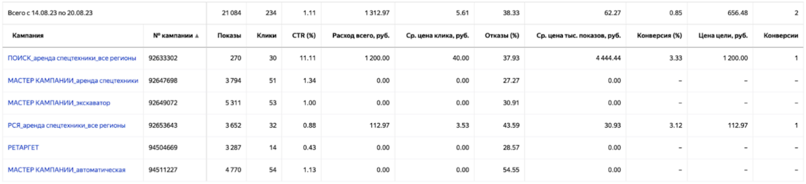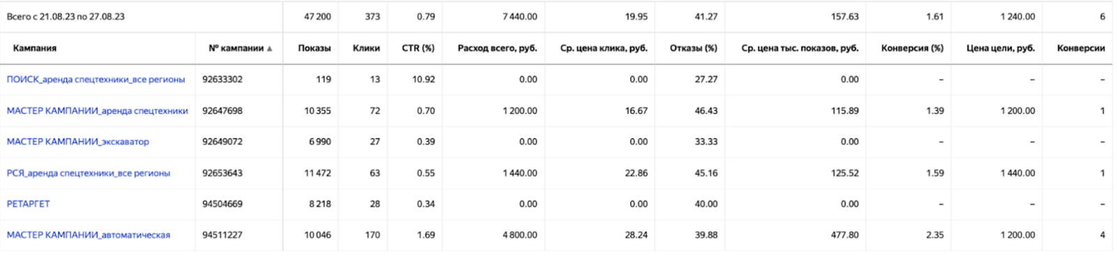 По цифрам показатели росли - показы, клики, ctr были в норме, поэтому решили наблюдать. На следующую неделю поставили задачу заменить все неэффективные элементы в кампаниях, отминусовать нецелевые запросы и повысить среднюю цену конверсии в кампаниях до 1.300₽.