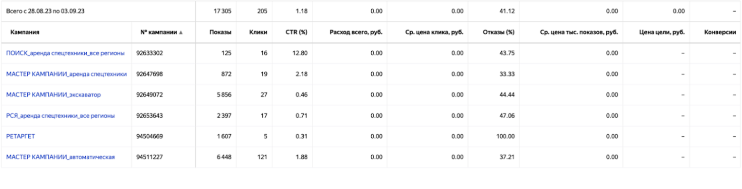 - Собрать отказную аудиторию за период "28 авг - 10 сен 2023г" в метрике и соответствующее внесение корректировок в кампанию ПОИСК;