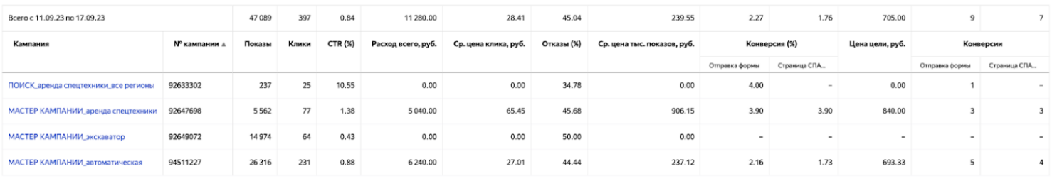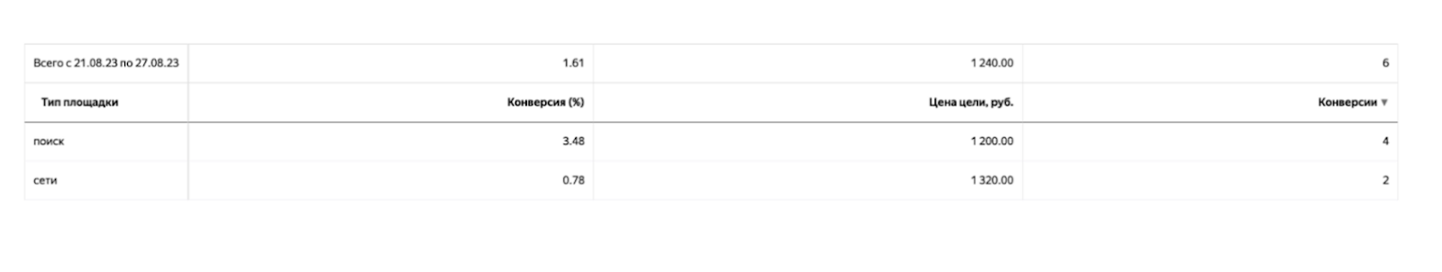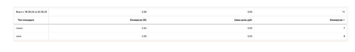 С 10 по 17 сентября получили 7 заявок с конверсии на страницу Спасибо. Цена цели при этом снизилась до 705 ₽.